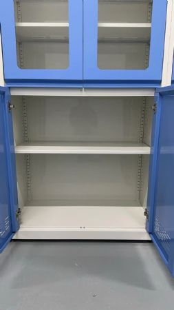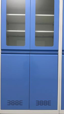 2.柜门:上下对开门,上门板为4mm透明玻璃门,下门为钢制双层结构实门,夹层内具消音材料,门板配置门扣组及缓冲垫;